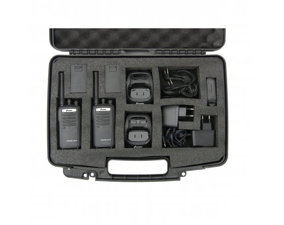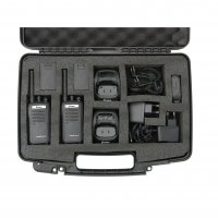 | Accessoires inclus | : | 2 x talkie-walkie 2 x Casque VOX 2 x Clips ceinture amovibles 2 x Pack accus Lithium-Ion 3.8v / 2000 mAh 2 x Chargeur mural 2 x Dragonne 2 x Housse de protection cuir Manuel d'utilisation |